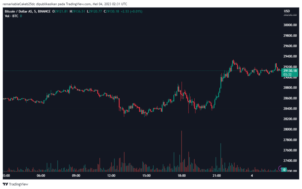 Berdasarkan data TradingView, harga BTC mengalami kenaikan nyaris 2% ke level harga terkini $29.130 per keping. Sementara emas sempat naik hampir 3% dari level harga $2.022 dan kini berada di kisaran $2.044. Grafik kenaikan emas dan BTC mulai terlihat setelah Powell mengumumkan kenaikan suku bunga pada FOMC antara pukul 18.00-18.30 UTC atau pukul 01.00-01.30 WIB dini hari.