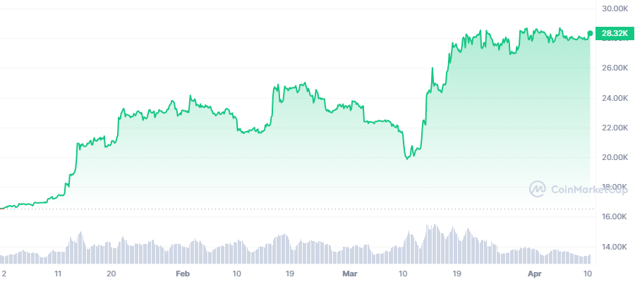 Harga Bitcoin ikut terus meningkat year-to-date. Setelah sempat ambles ke $16.000, BTC kini berada di kisaran $28.500, dan bahkan sempat menyentuh $29.000 untuk pertama kalinya dalam sembilan bulan terakhir.