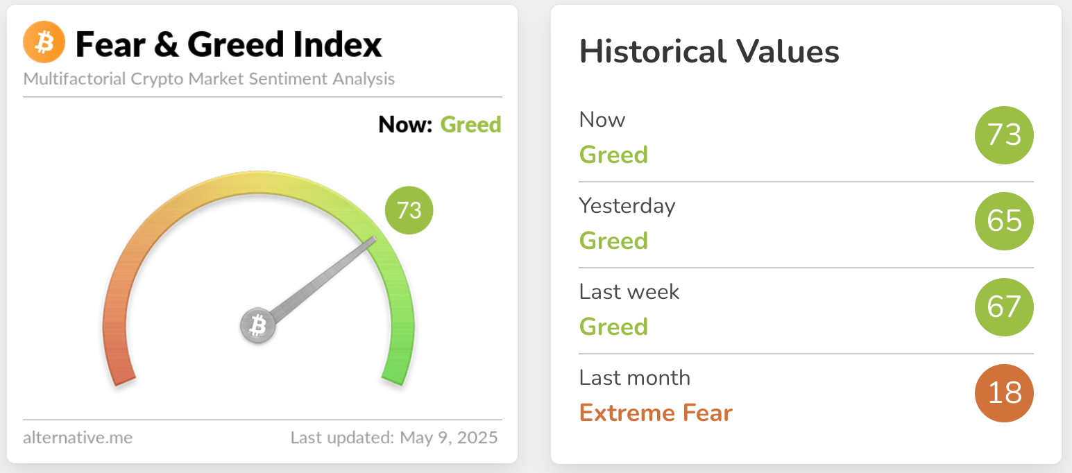 Meanwhile, the Crypto Fear & Greed Index surged from 65 to 73 in just 24 hours, reflecting growing investor optimism—or greed.
