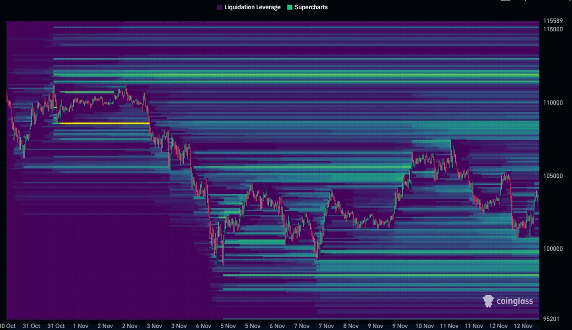 Peta likuiditas BTC menunjukkan ketidakseimbangan antara area support dan resistance. Trader Daan Crypto menyebut ada cluster likuiditas besar di bawah level lokal $98.000–$100.000, sejalan dengan pola higher low tipis yang terbentuk di atas zona tersebut.