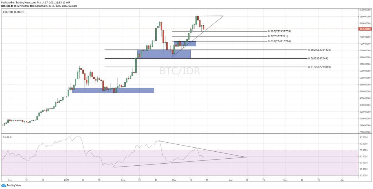 Pergerakan harga Bitcoin (BTC) berhasil menciptakan all time high (ATH) yang baru. Setelah bullish yang cukup panjang dari tanggal 7 Maret 2021 hingga terciptanya all time high (ATH) baru pada 13 Maret 2021. Setelah menginjak harga tertinggnya itu, harga Bitcoin cenderung terkoreksi. Walau sedang terkoreksi, pergerakan harga Bitcoin (BTC) masih dalam trend Bullish nya.