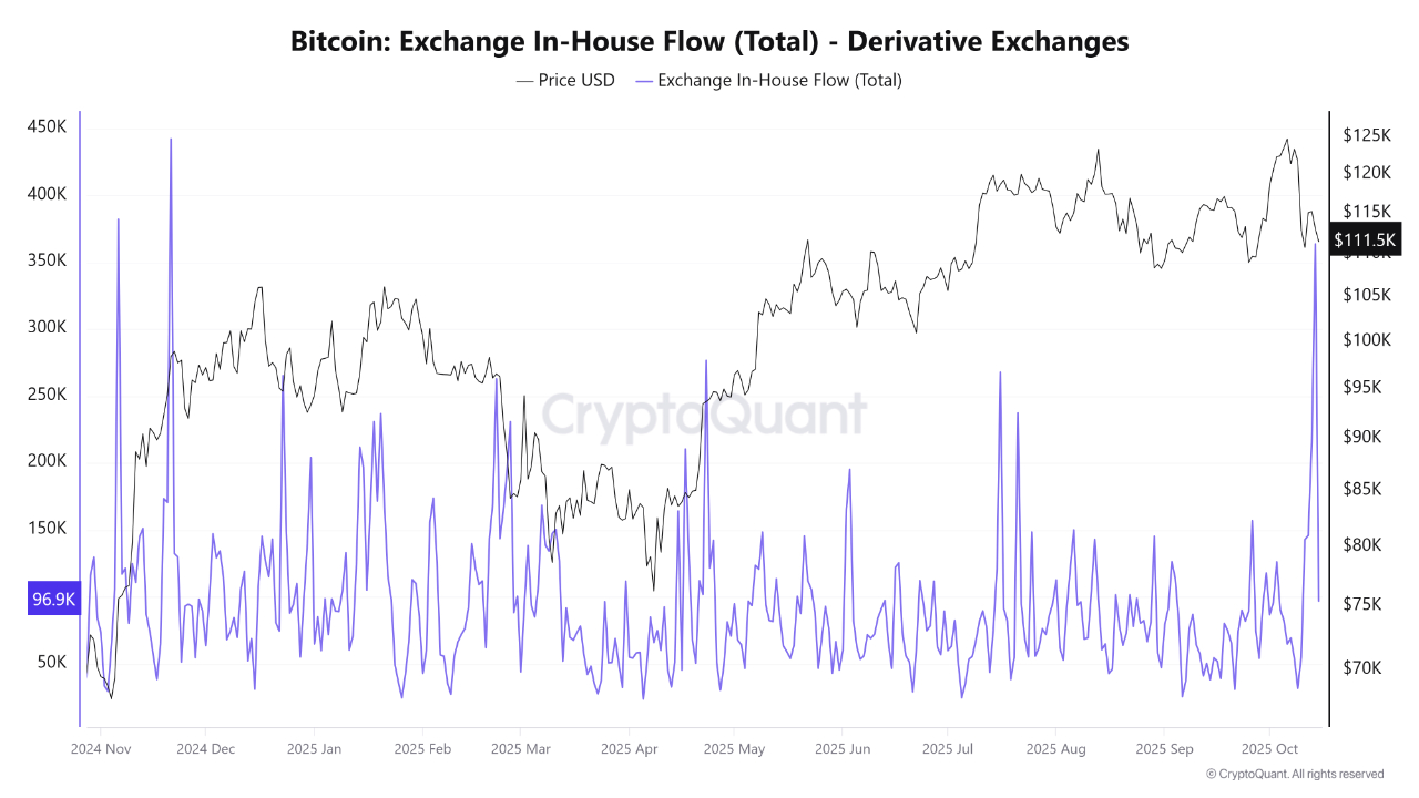 Namun, antara Kamis hingga Rabu lalu, sekitar 364.000 BTC berpindah secara internal di bursa derivatif — terutama di Bitfinex (210.000 BTC), Bybit (108.000 BTC), dan Binance (37.000 BTC).