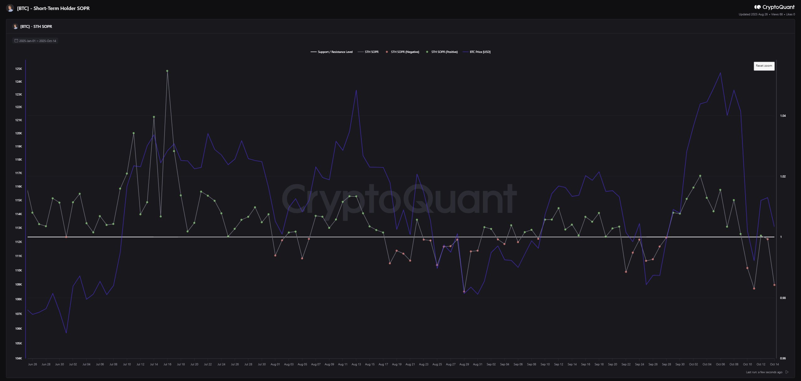Menurut analis kripto Maartunn, volume net taker di Binance menunjukkan tekanan jual yang masih berlanjut. Sementara itu, metrik STH Spent Output Profit Ratio (STH-SOPR) — yang mengukur apakah pemegang jangka pendek menjual dengan untung atau rugi — masih berada di bawah 1, menandakan banyak pelaku pasar yang masih melakukan profit-taking.