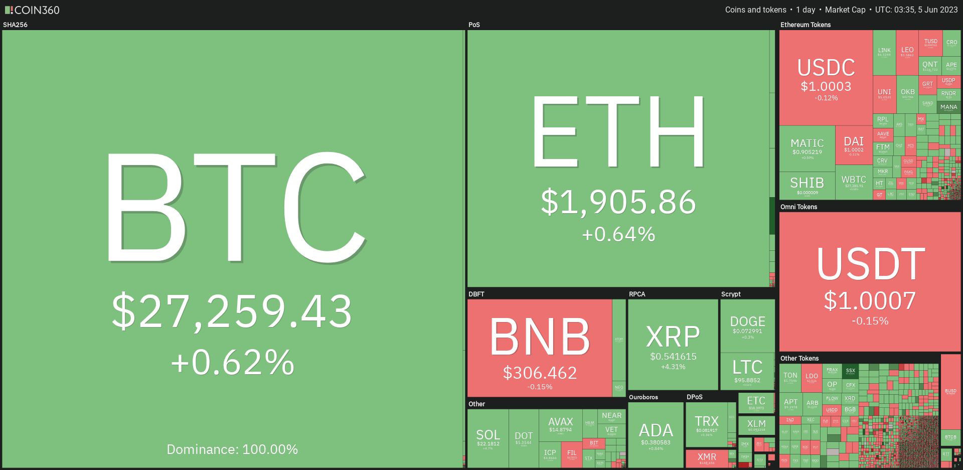 Kenaikan harga Bitcoin masih tertahan dinamis resistance yang merupakan 20-day EMA dan 50-day EMA pada area level $27,188-$27.352. Aksi beli yang mumpuni menjadi syarat utama untuk breakout area resistance tersebut.