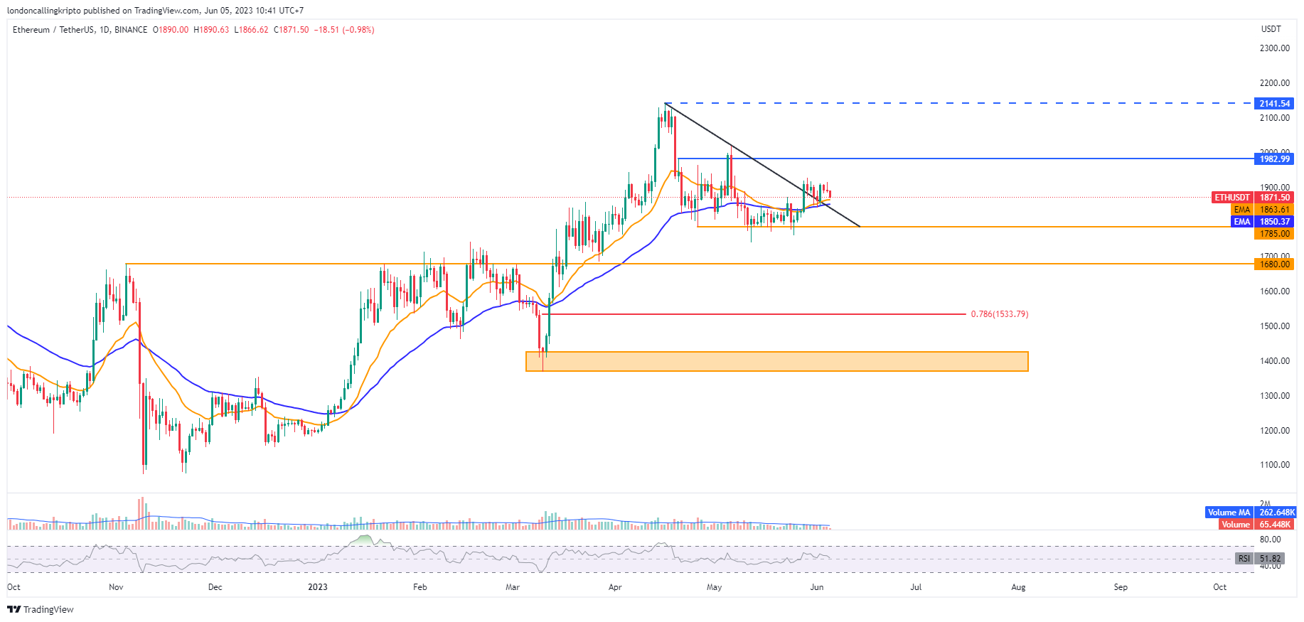 Saat artikel ini dibuat, pergerakan harga ETH kembali melemah yang menyebabkan penurunan harga. 20-Day exponential moving average (EMA) dan 50-day EMA membentuk cluster sebagai support pada area level $1.863-$1.850.