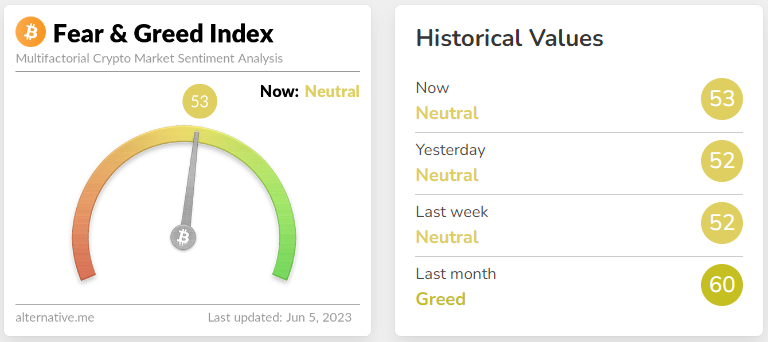 Sentimen pelaku pasar masih tidak banyak berubah menghadap kondisi pasar saat ini. Fear and Greed Index bergerak sideways pada area 50-52 dengan kategori Neutral.