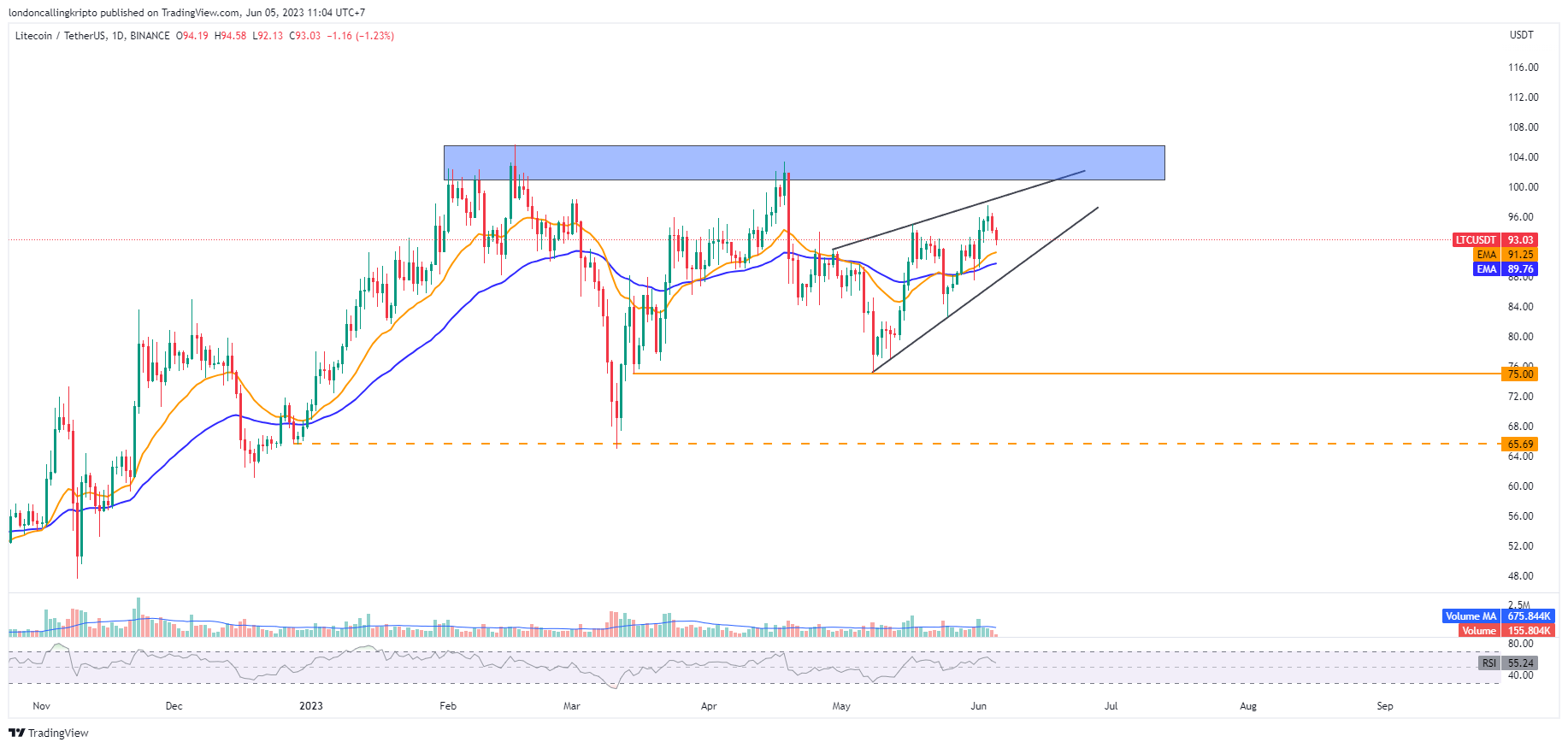 Pergerakan harga LTC mengalami koreksi ketika akan membentuk higher high (HH) dari pola rising wedge sebagai laju bullish-nya. Dinamis support yang merupakan 20-day EMA di level $91,25 merupakan support terdekat saat ini.