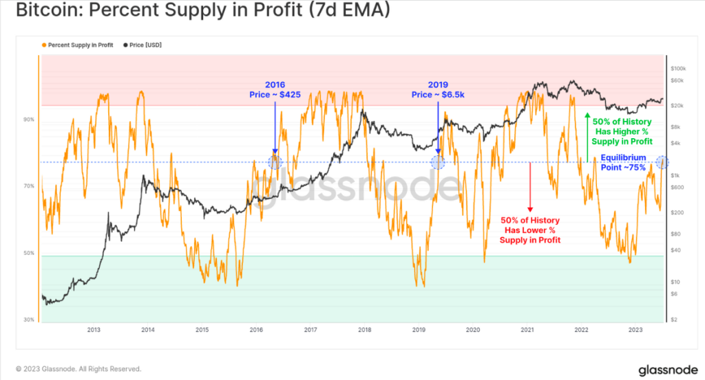 Portalkripto.com- Pergerakan Bitcoin saat ini memasuki fase re-akumulasi. Menurut laporan mingguan Glassnode, fase ini menunjukan adanya keseimbangan pasokan yang dipegang dengan keuntungan vs kerugian telah mencapai titik keseimbangan.