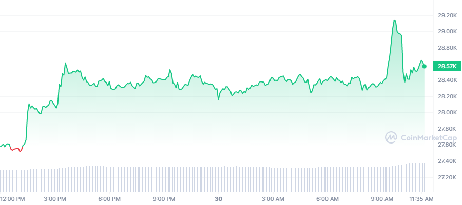 Grafik menunjukkan harga BTC saat ini masih dalam tren naik. Saat artikel ini ditulis, BTC diperdagangkan di harga $28.600.