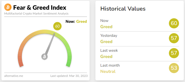 Crypto Fear and Greed Index, indikator sentimen pelaku pasar terhadap Bitcoin dan mata uang kripto lainnya, menunjukkan tren positif. Indeks menunjukkan angka 60 yang artinya pelaku pasar sedang dalam sentimen Greed.