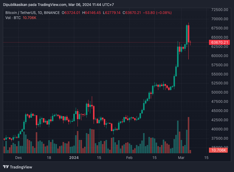 Portalkripto.com- Harga Bitcoin merosot sekitar lebih dari 10 % sesaat setelah mata uang kripto nomor satu berdasarkan kapitalisasi pasar itu mencapai rekor tertinggi baru sebesar $69.200 pada Selasa, 5 Maret 2024.