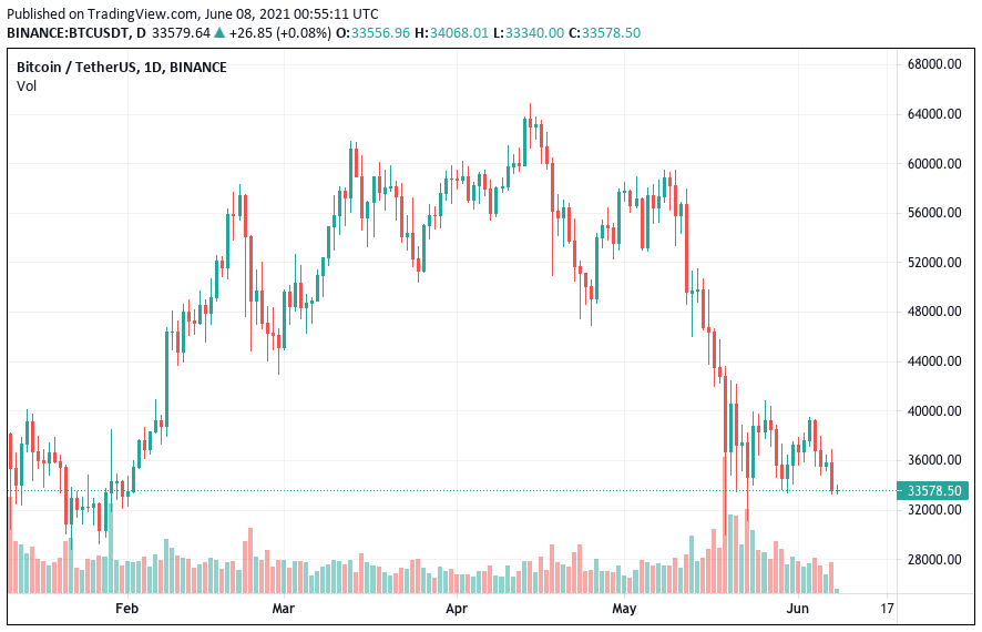 Portalkripto.com– Harga Bitcoin kembali terkoreksi ke level US$ 33 ribu atau turun sebesar 7,6%, pada perdagangan Selasa, 8 Juni 2021 (07.36 WIB). Penurunan ini merupakan yang paling rendah selama 7 hari terakhir. Pada perdagangan hari sebelumnya, Bitcoin nampak masih mengambang di harga US$ 36-37 ribu.
