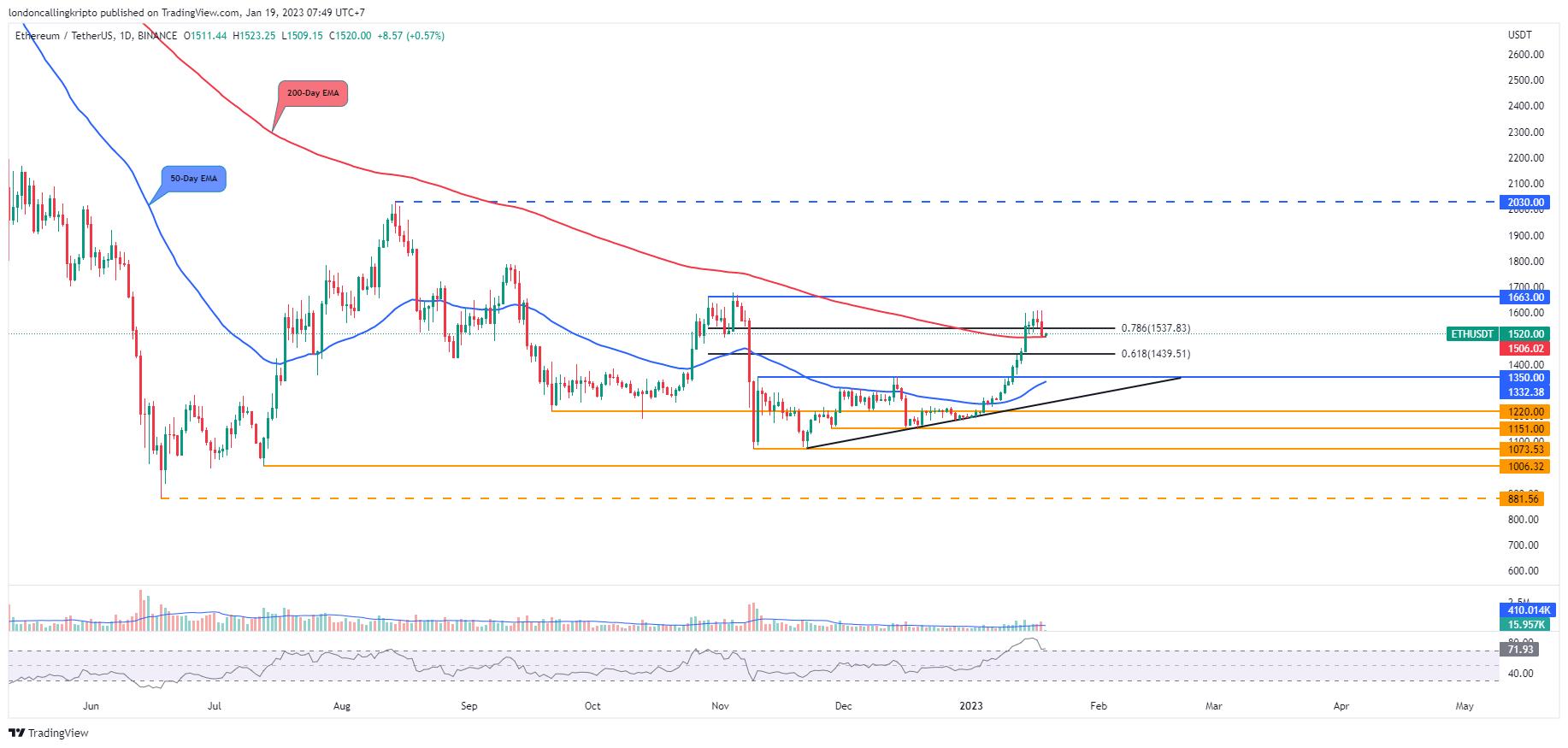 Pergerakan harga ETH kembali bergerak turun dan retest dinamis support pada 200-day EMA di level $1.505.