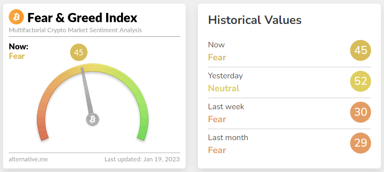 Koreksi harga yang terjadi pada penutupan kandil harian pagi ini berdampak negatif terhadap sentimen pasar. Fear and greed index turun tuju poin, ditutup pada level 45, dengan kategori Fear.