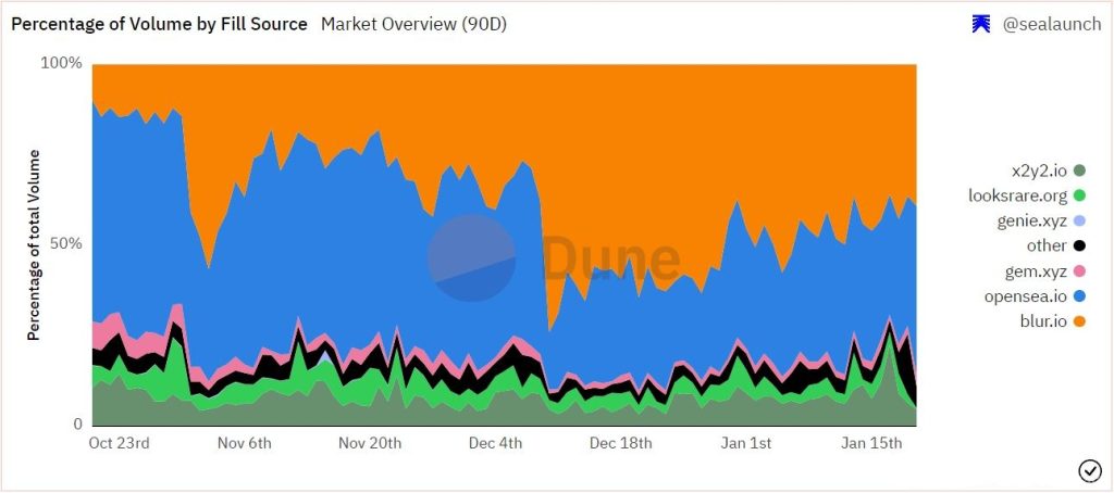 Blur juga menyumbang angka penjualan NFT terbesar kedua sebesar 31,3%, di bawah OpenSea 57%. Dari segi volume transaksi, Blur menyumbangkan angka 39,1%.