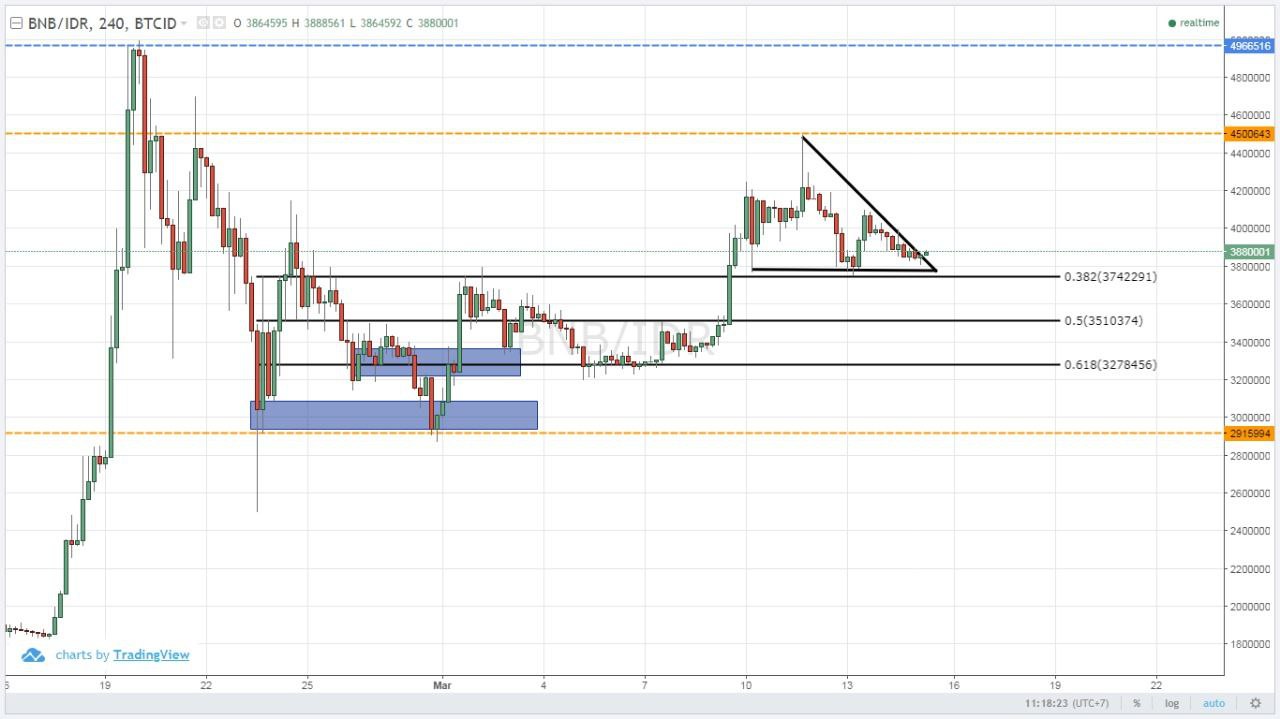 Mari, simak analisis teknikal grafik BNB dalam waktu dekat ini. Analisis menggunakan chart Indodax time frame 4 jam.