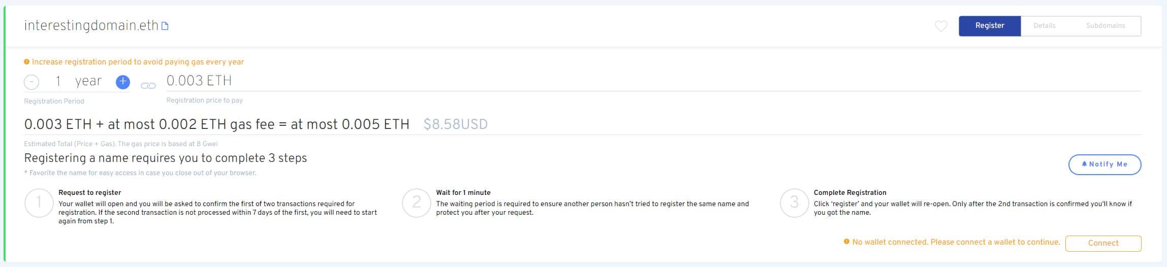 Untuk melakukan pendaftaran domain ENS, Anda harus memiliki hot wallet seperti MetaMask. Lalu masuk ke situs app.ens.domains dan tulis nama domain yang ingin didaftarkan. Situs akan mengecek apakah nama domain itu masih tersedia.