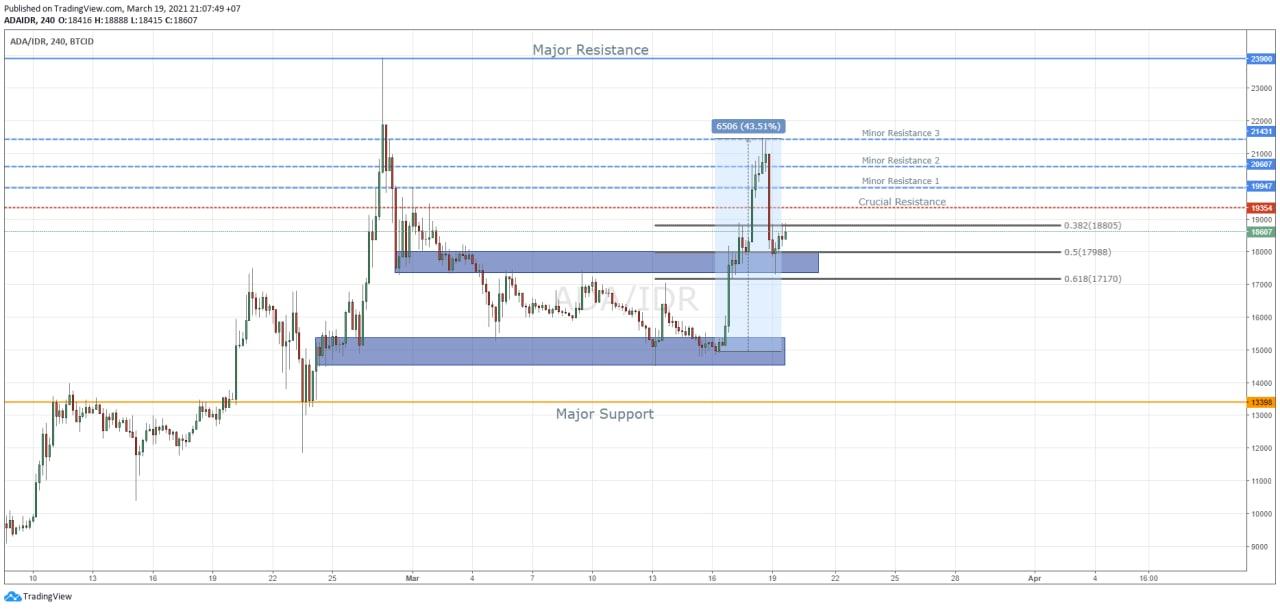 Crucial Resistance Cardano (ADA) saat ini berada pada 19,354, apabila Bullish maka pergerakan harga Cardano (ADA) akan mampu untuk menembus Minor Resistance nya.