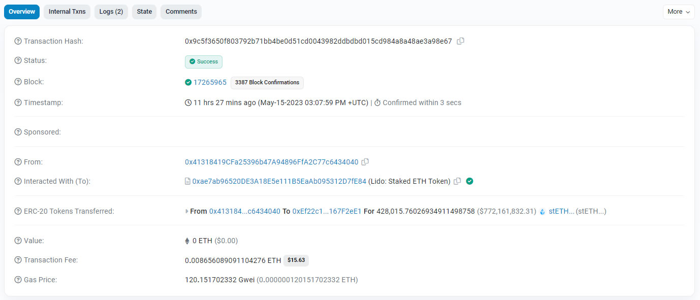Dana yang dipindahkan sebanyak 428.015 stETH senilai $781 juta atau sekitar Rp11,6 triliun. Diduga Celsius sedang melakukan persiapan untuk melakukan penarikan stETH dari Lido karena beberapa jam setelahnya perusahaan tersebut melakukan tes penarikan sebesar 0,1 stETh.