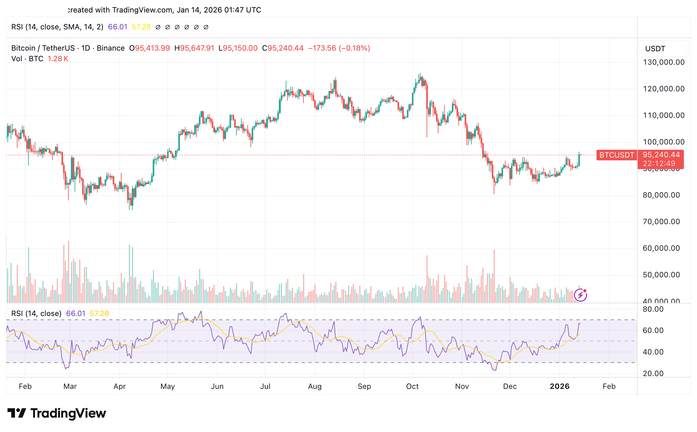 BTC menguat sekitar 4,5% pada Selasa (14/1/2026) dan diperdagangkan di kisaran