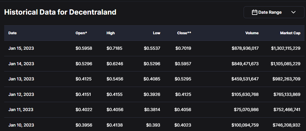 MANA mengalami penurunan yang cukup dalam pada periode 14 Agustus 2022 hingga menemukan lantai penurunannya pada 30 Desember 2022. Harga MANA turun sebesar 74,85% pada periode tersebut.