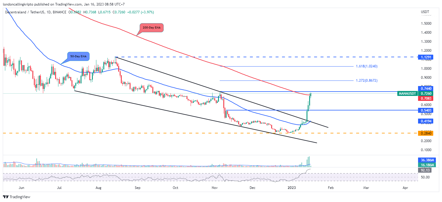 Sentimen positif didapat ketika laju naik MANA berhasil breakout falling wedge pattern pada 13 Januari. Hal tersebut menjadi pemicu yang baik untuk bergerak naik lebih tinggi.