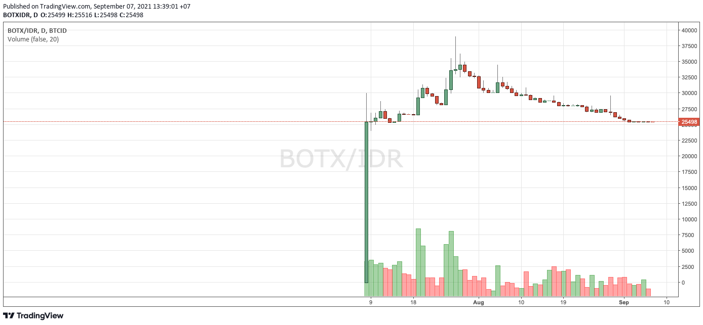BOTX is currently listed on a number of central exchanges. One of them is at Indodax. Based on charting data on Indodax, BOTX once reached its highest price at IDR 30.835 on July 26, 2021, or a few days since this token was listed on Indodax.
