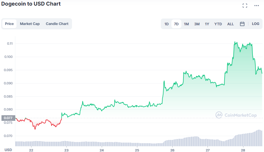 Menurut data CoinMarketCap, harga Dogecoin naik dari $0,0893 menjadi $0,1057. Saat ini DOGE diperdagangkan di harga $0,09465.