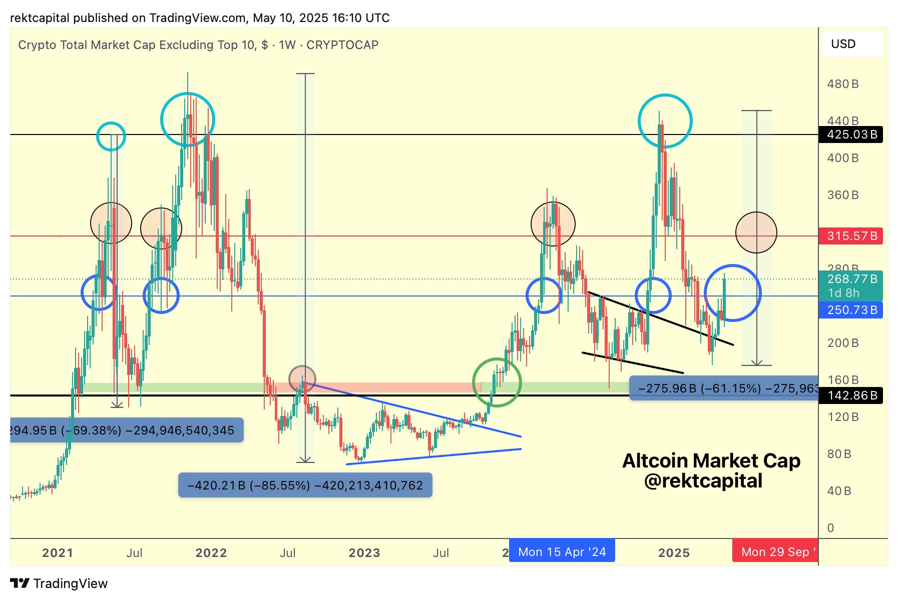 Selain itu, analis ini menyebutkan bahwa pasar altcoin tengah mendekati titik penting. “Penutupan mingguan di atas $250 miliar (lingkaran biru) kemungkinan besar akan mendahului reli breakout menuju setidaknya $315 miliar (lingkaran merah),” tulisnya di X.