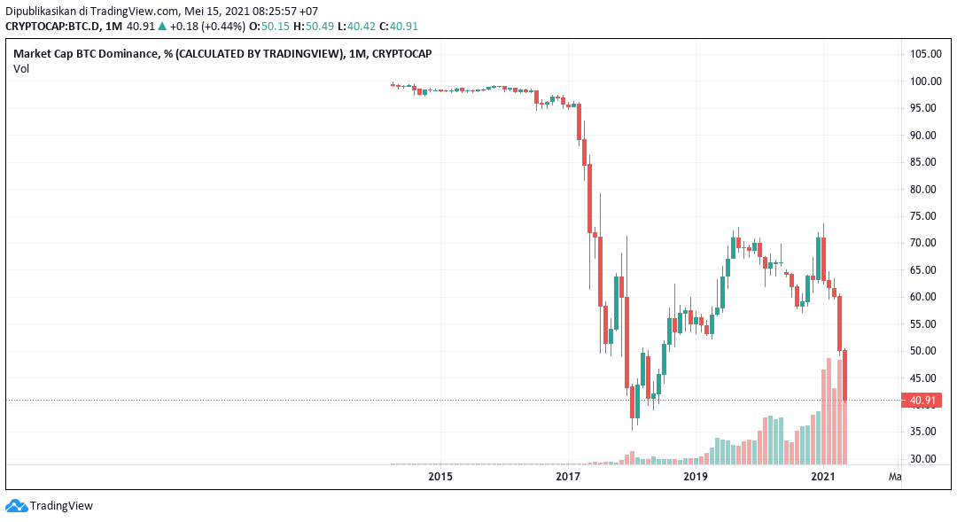 Berdasarkan data chart Tradingview dan Coingecko dominasi BTC hari ini, 15 Mei 2021, menjadi yang terburuk sejak tahun 2019. BTC dominance sempat anjlok hingga 39%.Â
