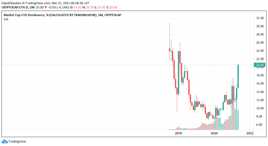 Ethereum menjadi koin dengan peningkatan kapitalisasi pasar paling besar. Dalam satu bulan terakhir, ETH menambahkan dominasi mereka hingga sekitar 8%.