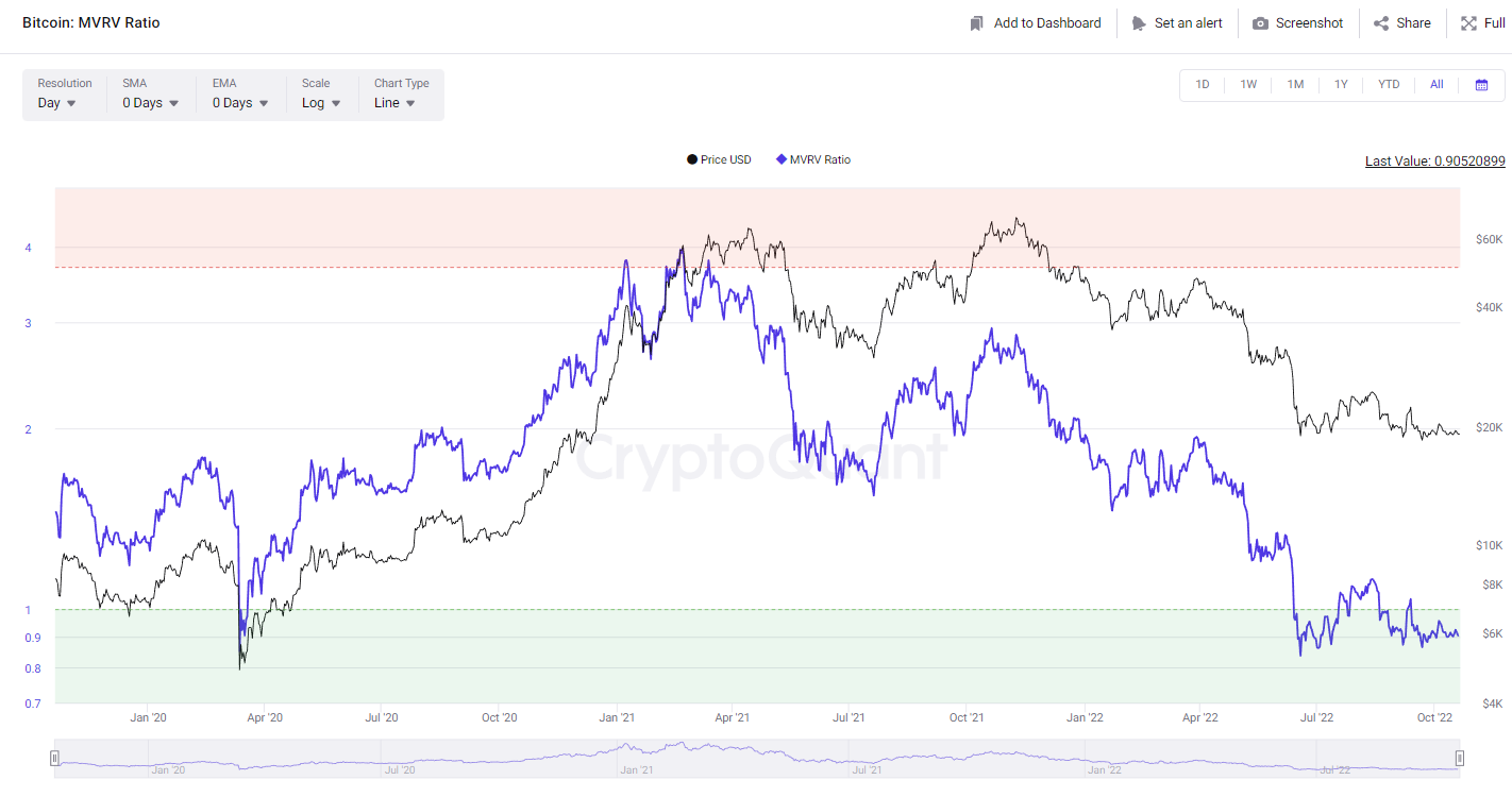 Penurunan harga Juni 2022 hingga saat ini, mengakibatkan MVRV ratio Bitcoin berada di bawah angka 1, mengindikasikan bahwa harga Bitcoin sudah berada di lantai dasar dari penurunan musim dingin saat ini.