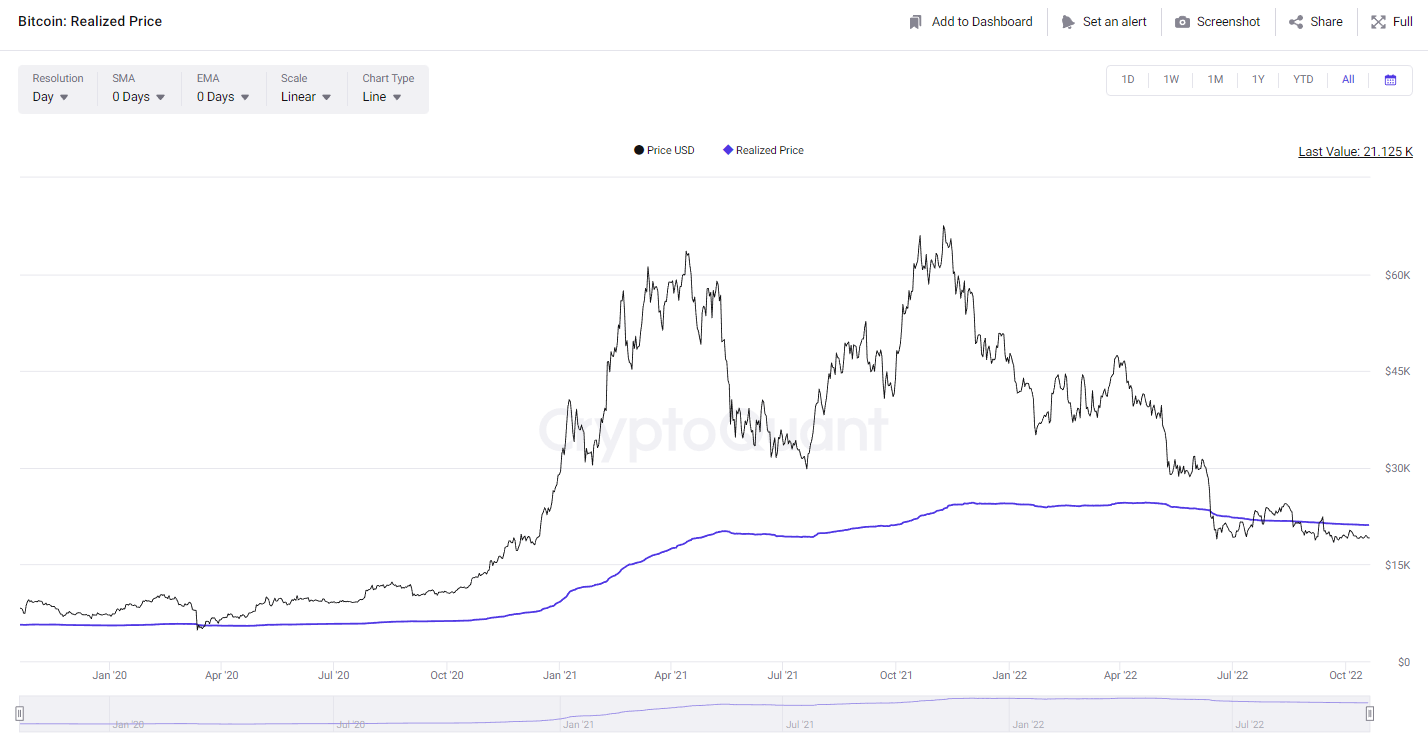 Realized Price merupakan hasil bagi antara realized cap yang telah dihitung oleh cryptoquant dengan total coin supply saat ini. Berdasarkan perhitungan tersebut, harga Bitcoin seharusnya berada pada level $21.125.