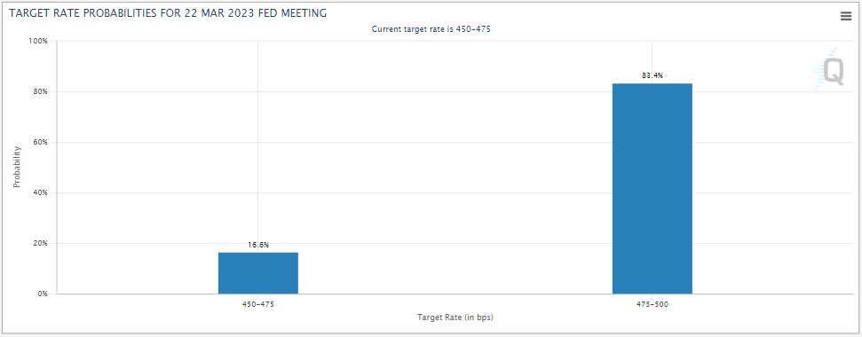 Level probabilitas kenaikan 25 bps ini mencapai 83,4% per 15 Maret. Tingkat kenaikan suku bunga ini lebih rendah ketimbang data pekan lalu yang memproyeksi kenaikan suku bunga dominan di angka 50 bps.