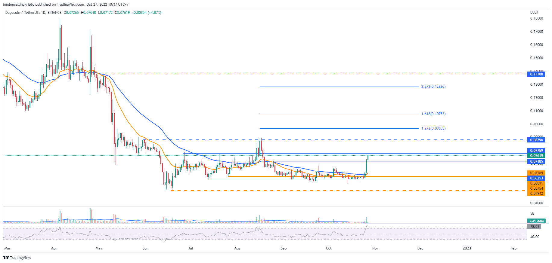 Naiknya harga DOGE tersebut terlihat mendekati resistance selanjutnya yang berada pada level $0,07759.