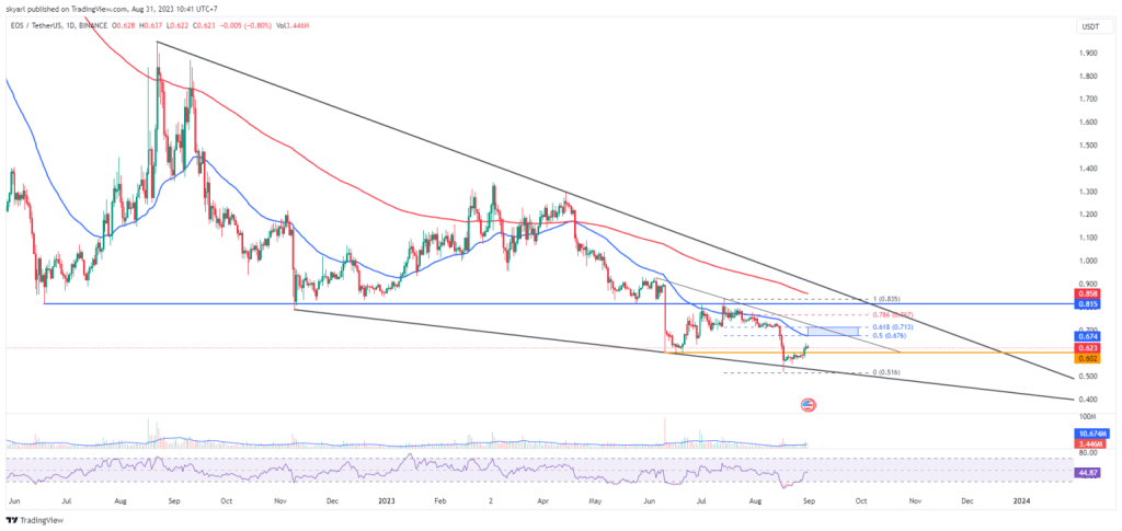 Market crash yang terjadi pada 17 Agustus membawa EOS menukik lebih tajam dan menciptakan harga terendah sementara pada tahun 2023 di level $0,517. Pasca kejadian tersebut, pergerakan harga EOS cenderung bergerak sideways.