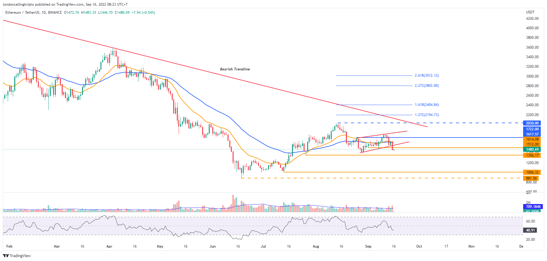 Penutupan kandil harian ETH ditutup dibawah support pada level $1.512 yang sekarang menjadi resistance terdekat jika harga ETH kembali bounce.