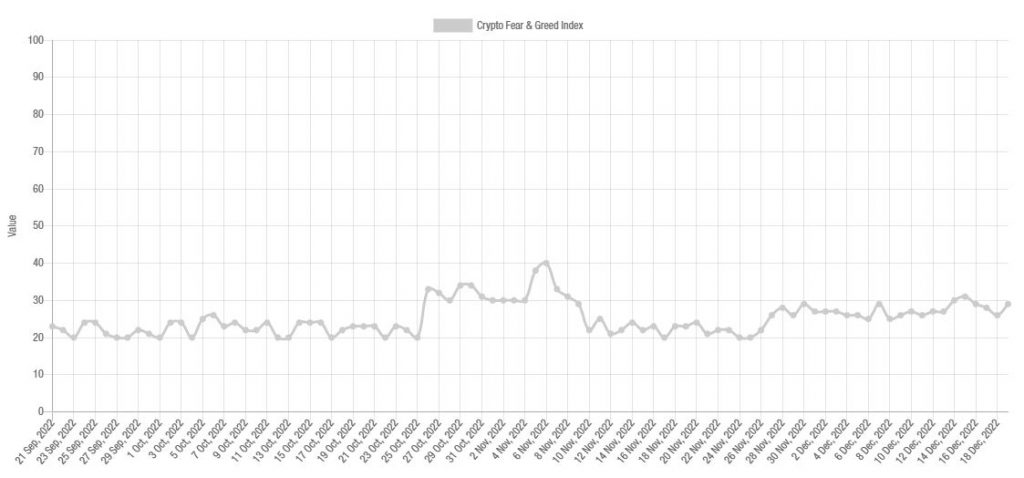 Per 19 Desember 2022, Crypto Fear & Greed Index menunjukkan angka 29. Artinya, sentimen fear, uncertainty, and doubt (FUD) masih membekap pasar dan mempengaruhi keputusan jual-beli investor yang membuat pasar lesu.