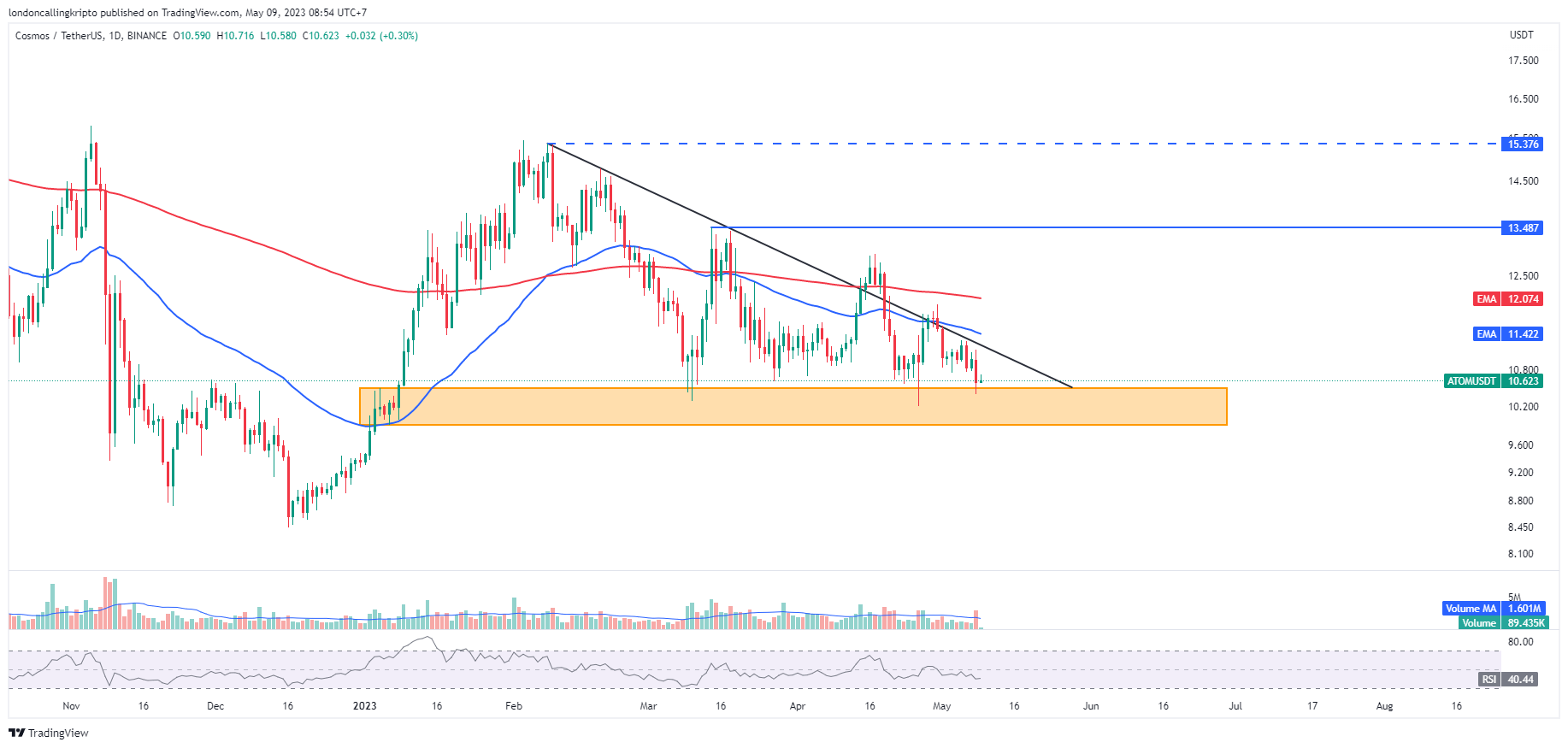 Pergerakan harga ATOM kembali mengalami penolakan ketika usaha rebound menyentuh dinamis resistance 50-day EMA pada tanggal 30 April. Hal tersebut menyebabkan penurunan harga yang terjadi saat ini.
