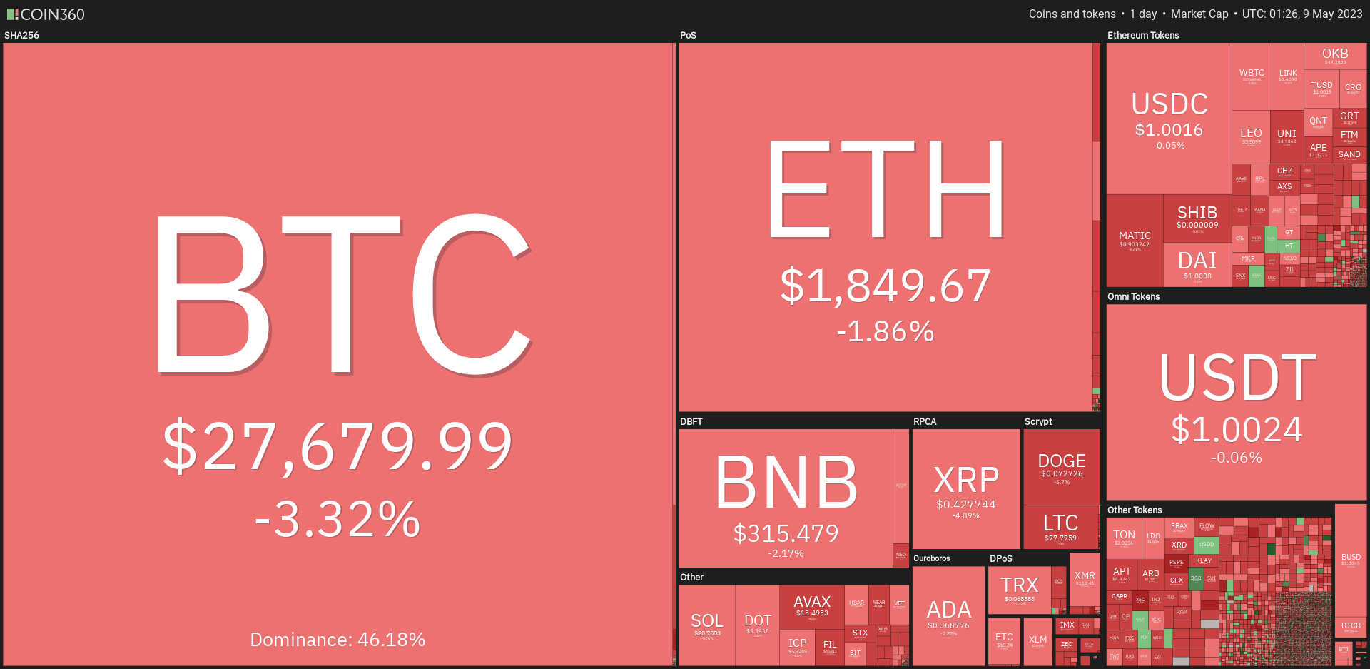 Bitcoin kembali melanjutkan penurunan harga setelah mengalami penolakan ketika laju naik menyentuh descending line pada tanggal 6 Mei. Kandil harian Bitcoin ditutup merah dengan penurunan sebesar 2,68%.