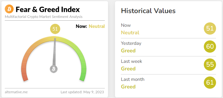 Penurunan harga yang terjadi dalam beberapa terakhir cukup berdampak pada sentimen pelaku pasar. Fear and Greed Index turun hingga sembilan poin, ditutup pada level 51 dengan kategori Neutral.
