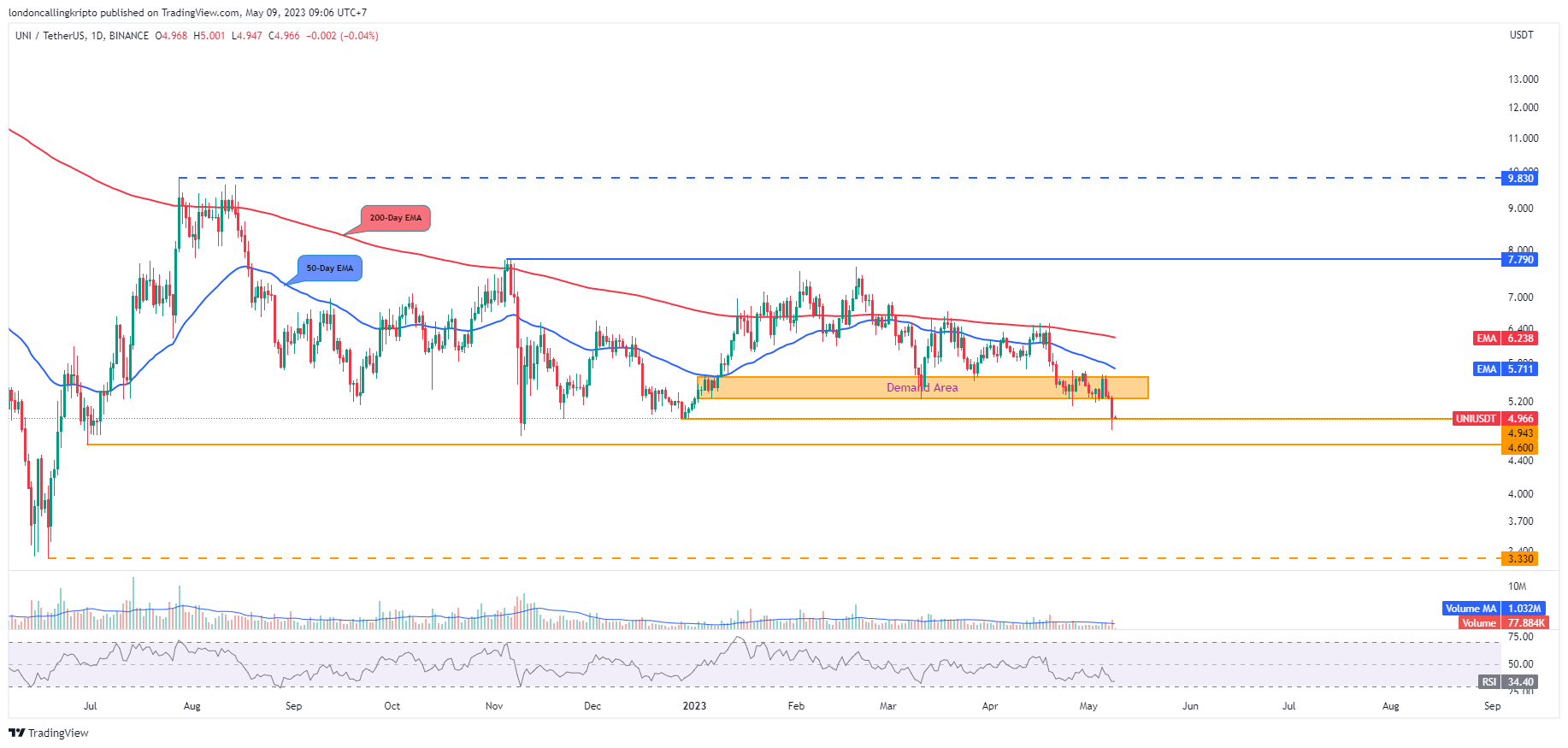 Setelah breakdown area demand, penurunan harga UNI menyentuh titik support selanjutnya yang merupakan harga terendah pada penutupan kandil harian 28 Desember 2022 di level $4,943.