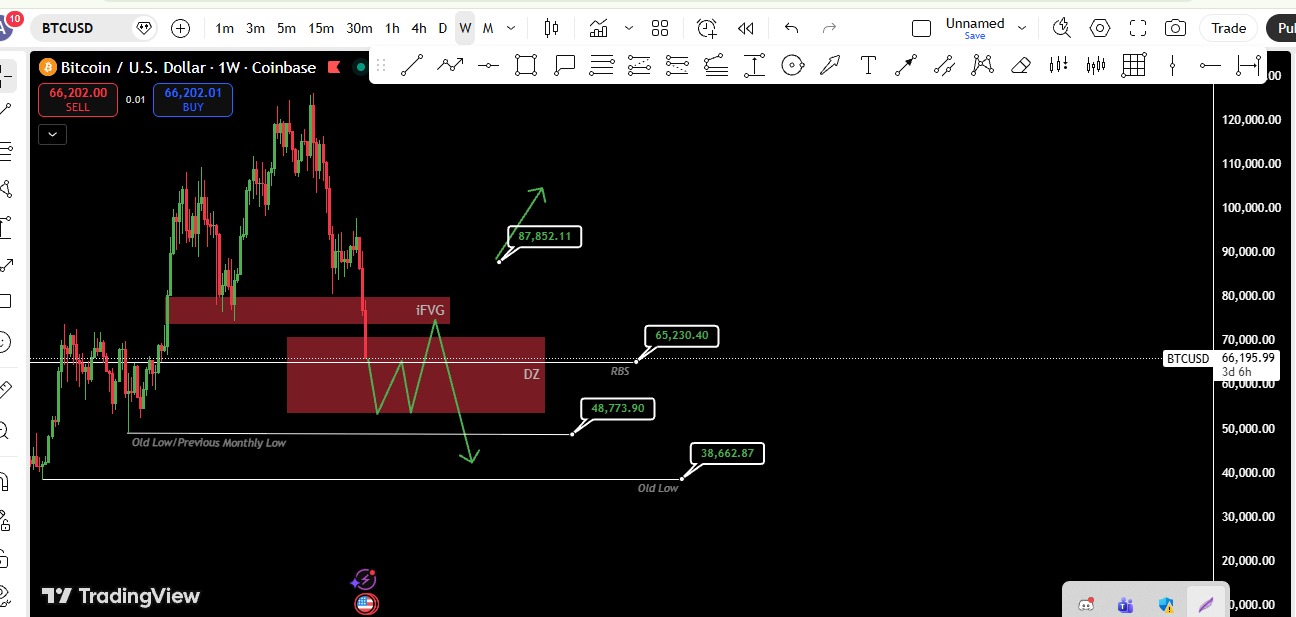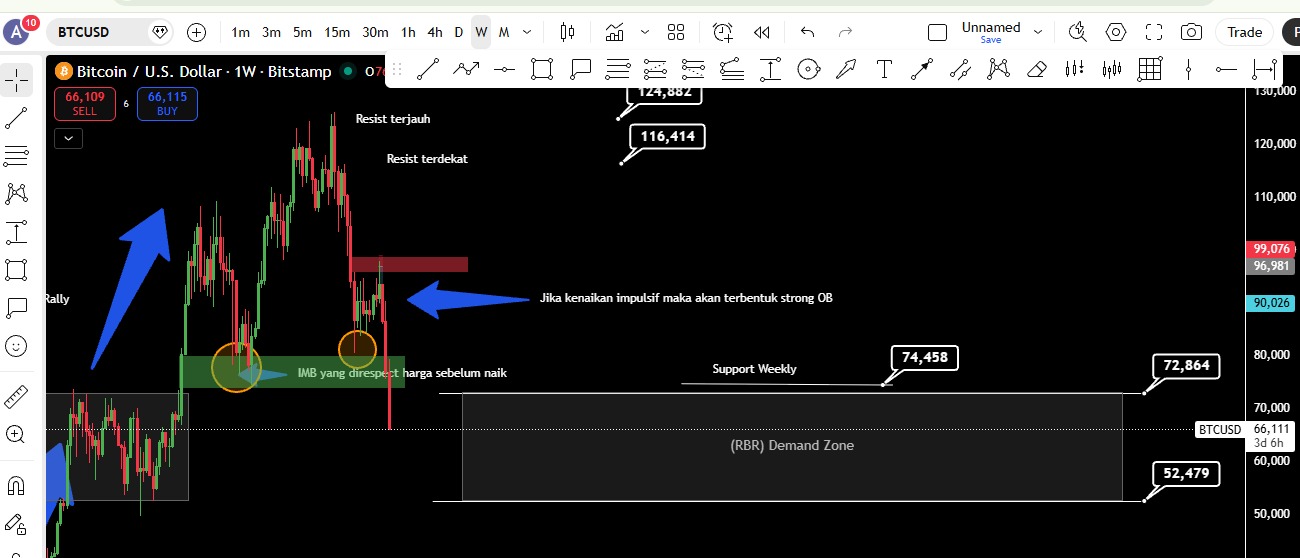 Menurutnya, pergerakan harga Bitcoin (BTC) masih berada dalam fase krusial setelah tekanan jual tajam dalam beberapa hari terakhir. Berdasarkan analisis teknikal pada timeframe mingguan, pasar saat ini berpotensi menembus area RBS (Resistance Become Support) sebelum memasuki fase ranging di zona DZ (Discount Zone).