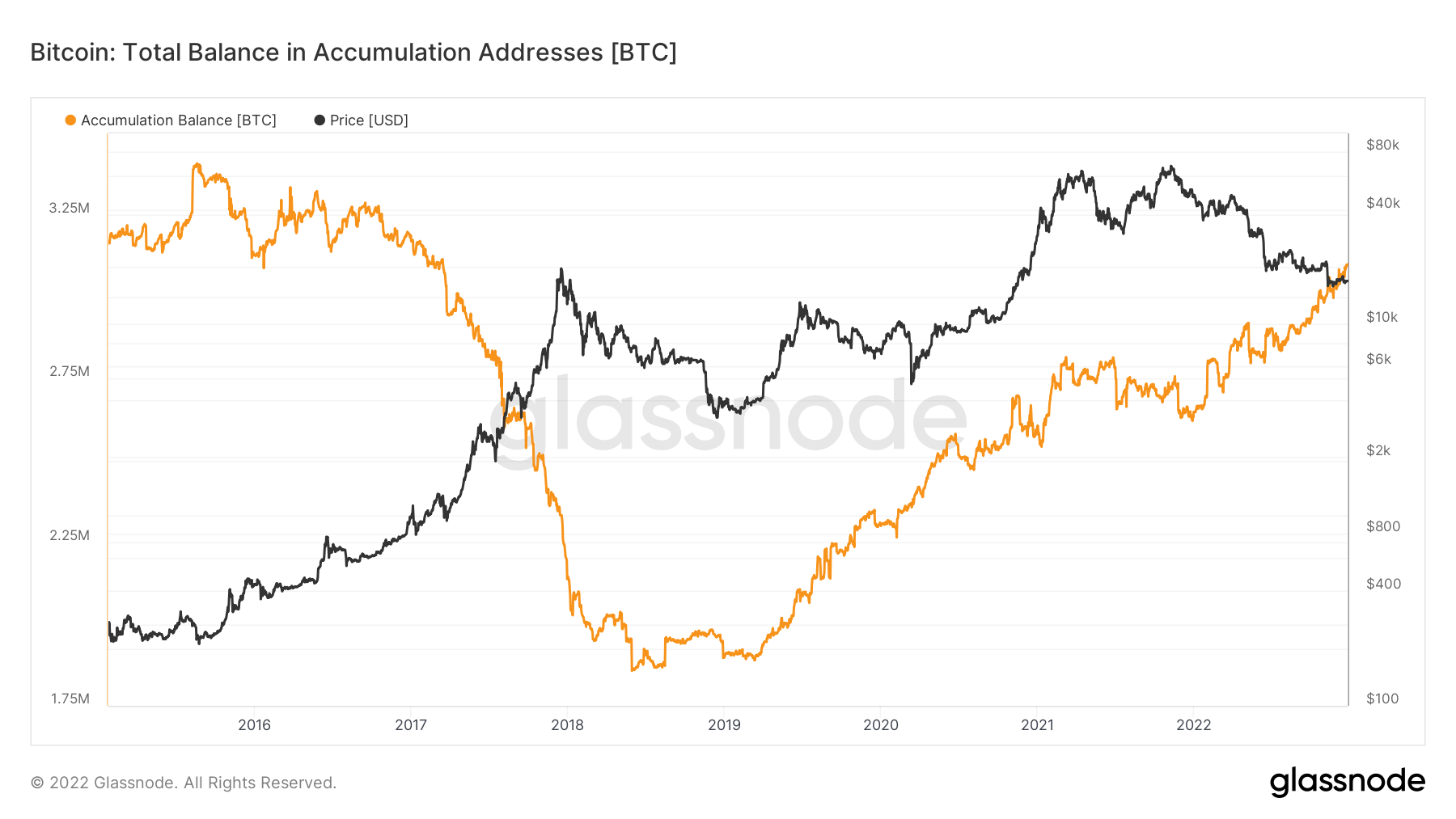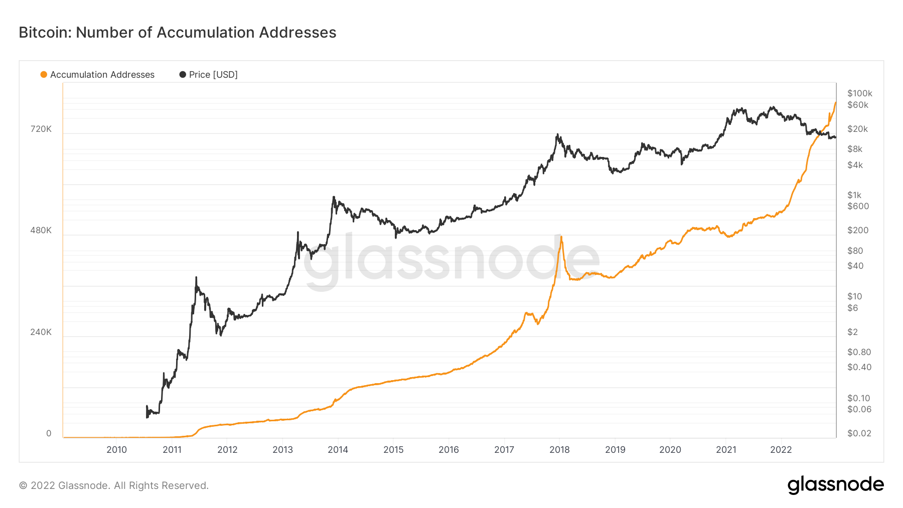 Meski pasar terguncang dan harga Bitcoin telah melesak jauh dari all-time high (ATH), wallet akumulasi yang melakukan HODL Bitcoin ternyata terus bertambah. Menurut data Glassnode, wallet akumulasi Bitcoin telah mencapai ATH dengan total sebanyak 793.591 wallet per 25 Desember 2022.