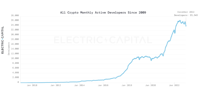 Portalkripto.com —Â Meski pasar kripto anjlok hingga 70% sepanjang 2022, pengembang Web3 yang aktif membangun ekosistem ternyata terus bertambah. Menurut laporan Electric Capital yang dirilis 16 Januari 2023, tercatat ada 61.127 pengembang Web3 baru pada 2022 atau naik 25,8% dari 2021.