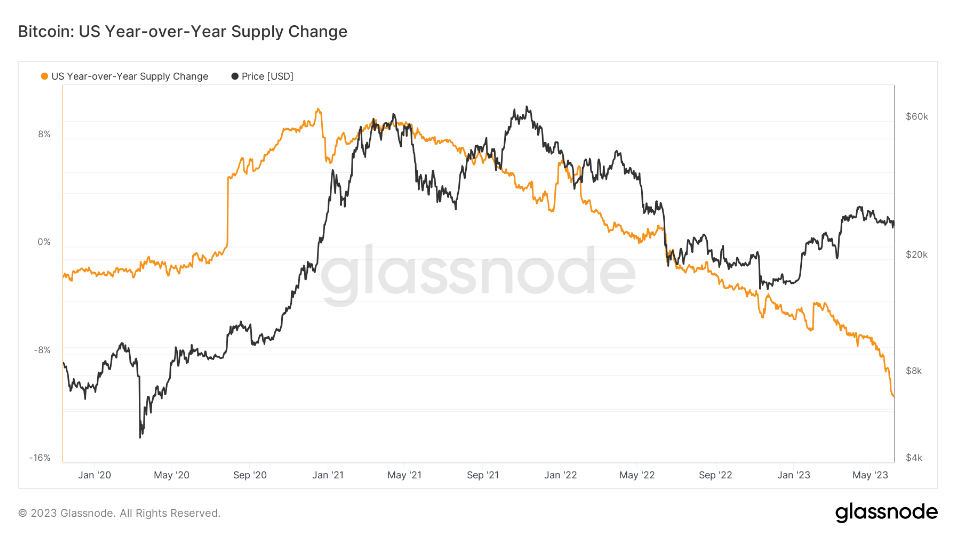 Menurunnya pasokan Bitcoin di AS sebenarnya telah dimulai sejak Maret 2021. Namun, penurunan cukup pesat terjadi pada Mei tahun ini.