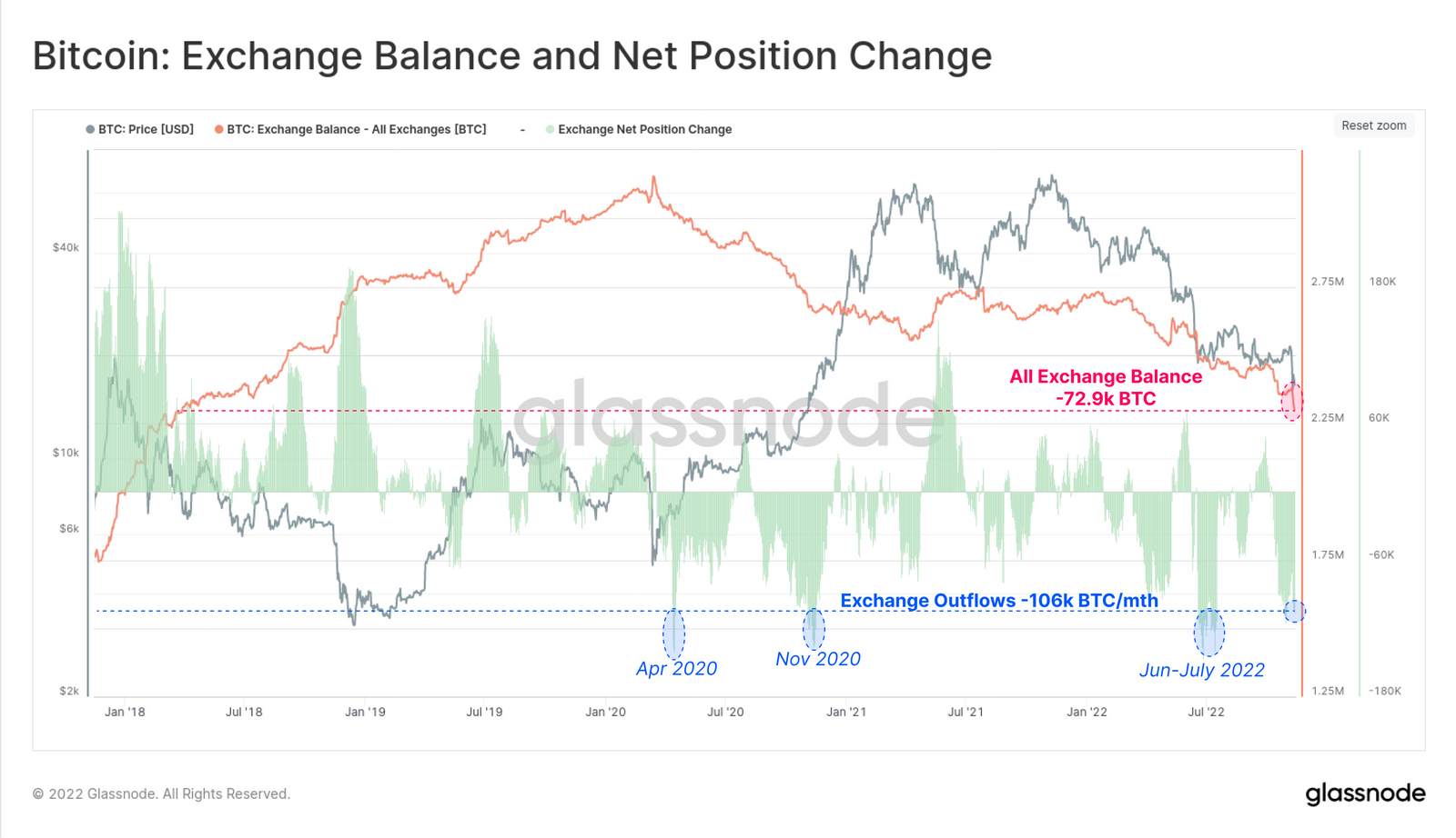 Jumlah BTC di dalam exchange kini tersisa 2,25 juta. Pergerakan ini serupa dengan pergerakan pada periode April 2020, November 2020, dan Juni 2022.