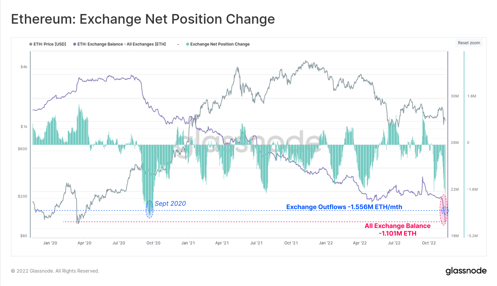 Menurut Glassnode, penurunan jumlah ETH di exchange menyentuh titik terendah sejak September 2020.
