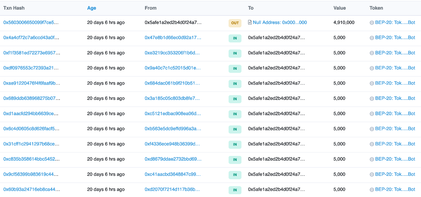 Di awal proses, TokenBot mengirim tokennya kepada 4.000 wallet. Namun 3.300 wallet di antaranya langsung mentransfer token TKB yang baru diterima ke satu wallet.