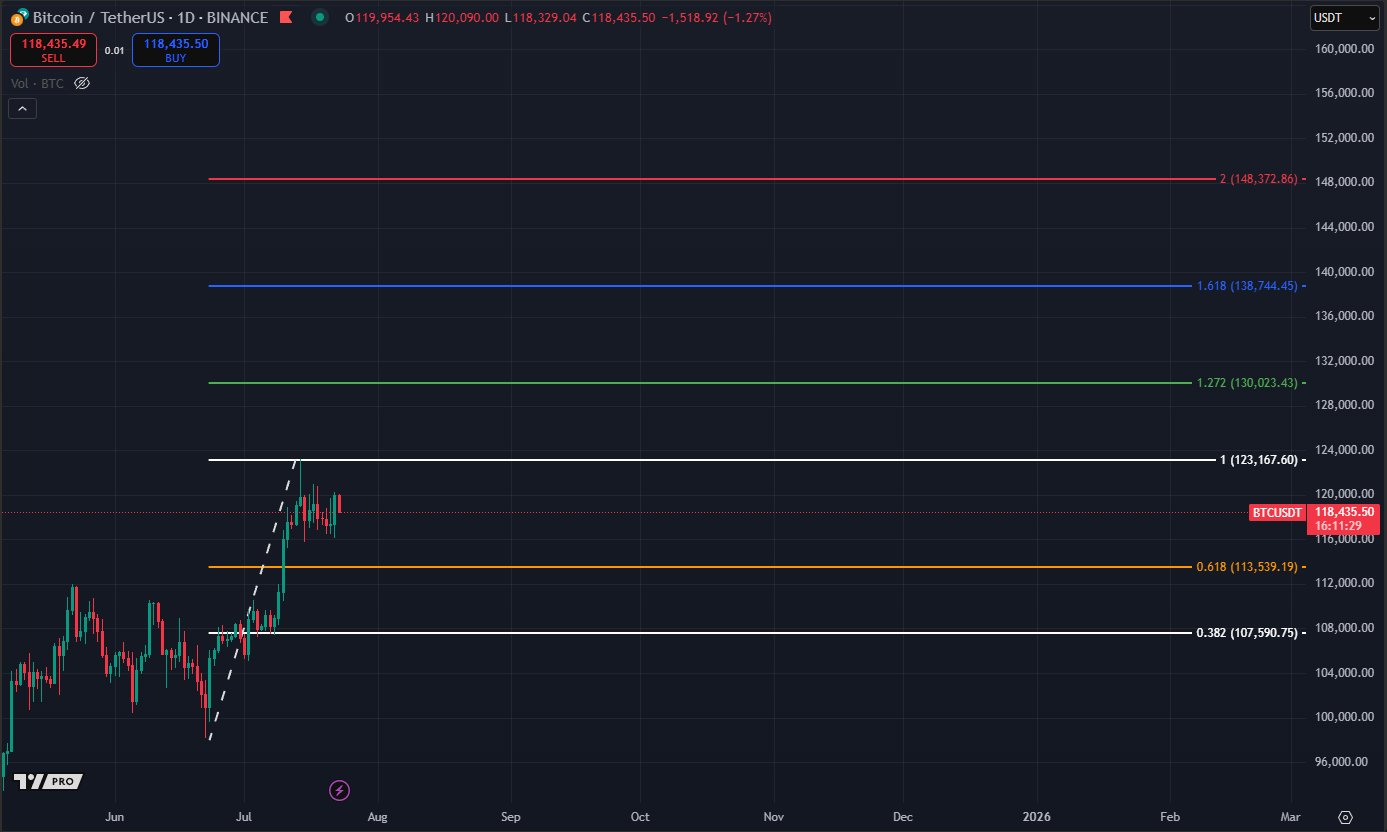 Sementara itu, trader populer Crypto Virtuos menyarankan bahwa target penurunan berikutnya bisa mencapai $113.000, didasarkan pada level retracement Fibonacci penting di angka 0,618.